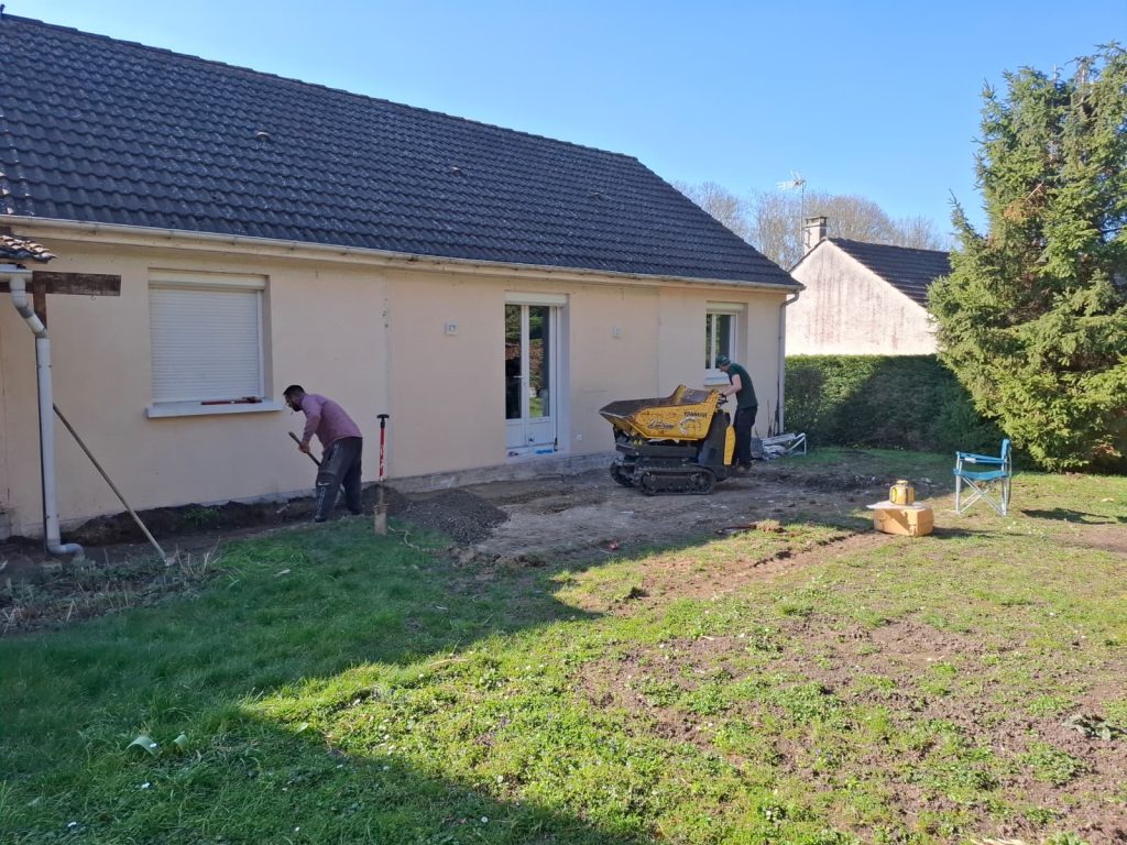 L’ancienne dalle béton de 26 m² a ensuite été entièrement démolie. Ce travail nécessite un brise-roche hydraulique et génère un volume conséquent de gravats (environ 4 à 5 tonnes pour une dalle de cette surface). L’ensemble a été chargé en camion-benne et évacué en décharge de matériaux inertes.