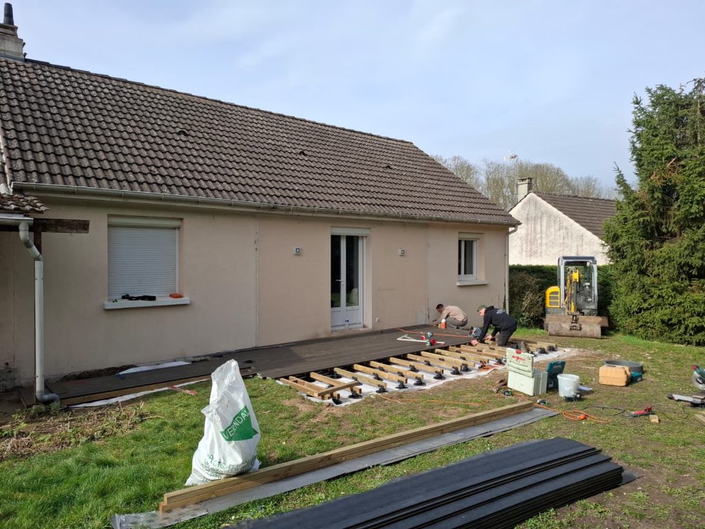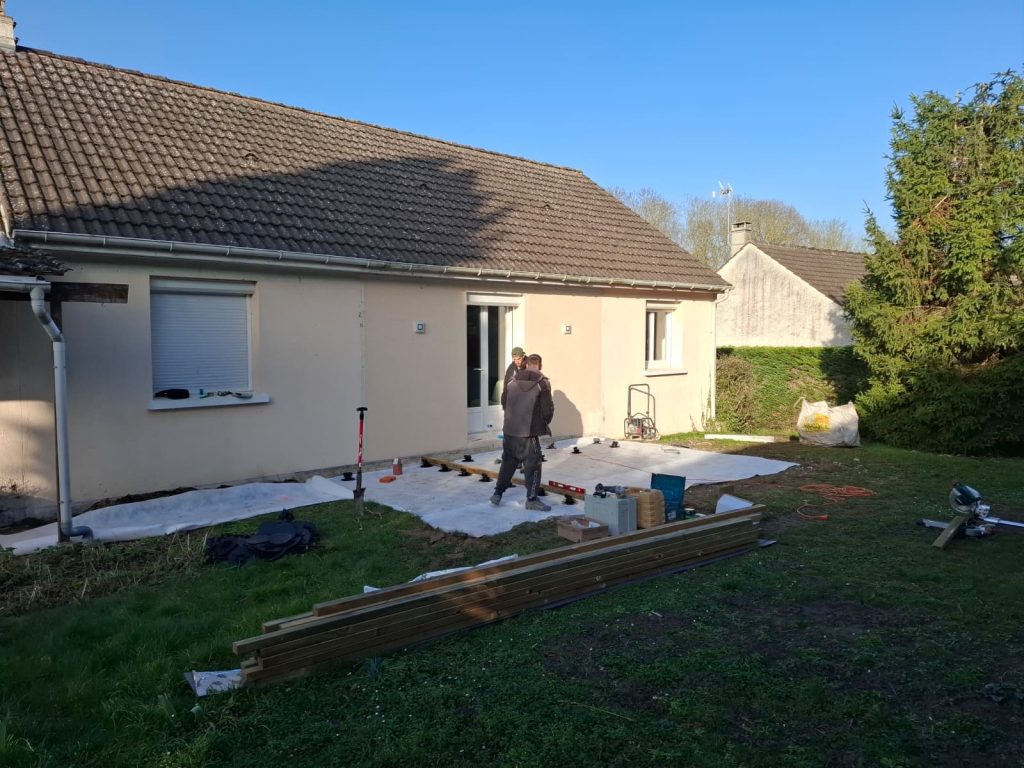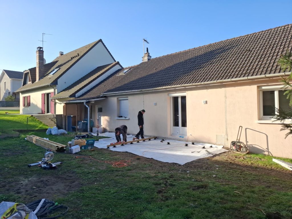 Dans le cas de notre chantier à Thorigny-sur-Marne, le choix de trois revêtements différents permet d’adapter chaque zone à son usage : le composite pour la détente, le carrelage collé pour la zone de repas en prolongement de la maison, les dalles sur plots pour un espace polyvalent. Cette approche sur mesure est ce que nous recommandons systématiquement plutôt qu’un revêtement unique sur l’ensemble de la surface.